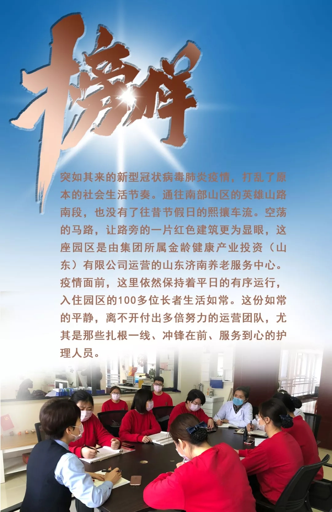 除了一線人員的敬業(yè)奉獻(xiàn),金齡健康提前謀劃、整體布局,用扎實(shí)行動(dòng)確保打贏疫情阻擊戰(zhàn)。