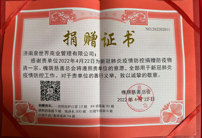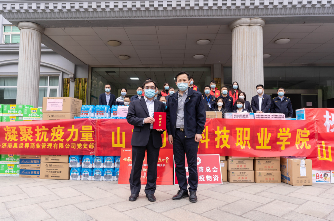 此次活動,濟南泉世界商業管理有限公司黨支部積極組織干部職工向槐蔭區住建局、槐蔭區城管局、槐蔭區交警大隊捐贈口罩、84消毒液、消毒酒精、礦泉水、方便面等防疫用品和生活物資,同時對一線工作者表示敬意。